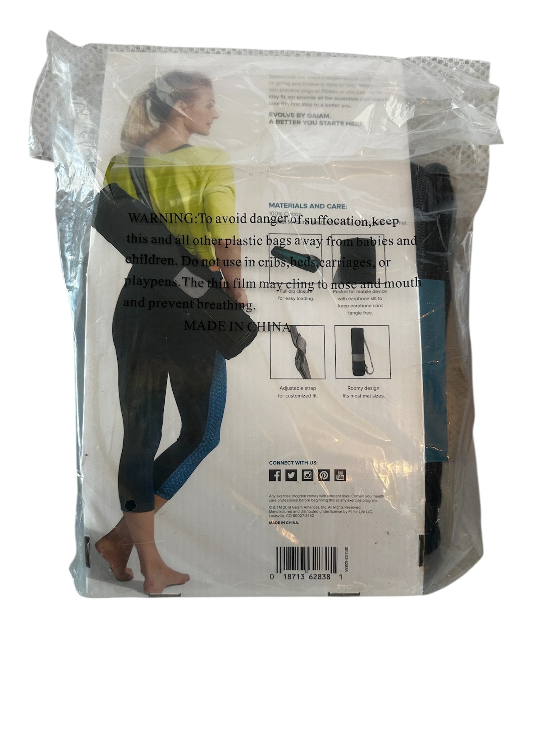 This sleek Gaiam mat bag features a durable black/grey design, full‑zip closure, large front zip pocket for essentials, and an adjustable shoulder strap so you can grab your gear and go.